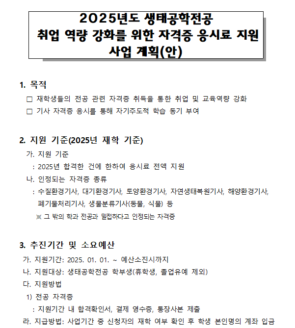 | 2025학년도 생태공학전공 전공 자격증 응시료 지원 안내 | |||