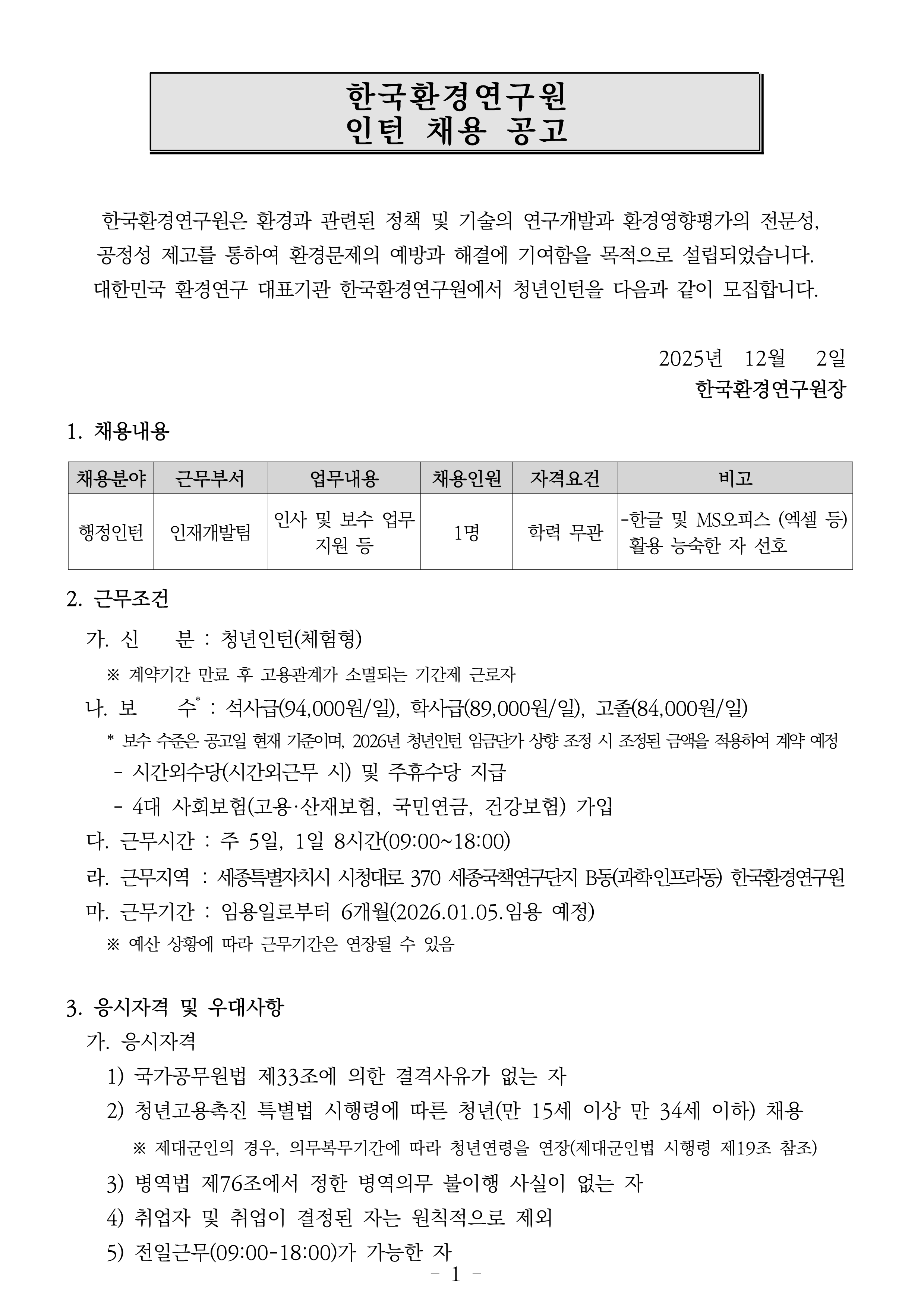 환경과 관련한 정책 및 기술 개발과 관련한 한국환경연구원에서 인턴을 채용하오니 참고바랍니다.