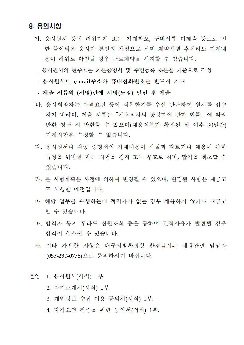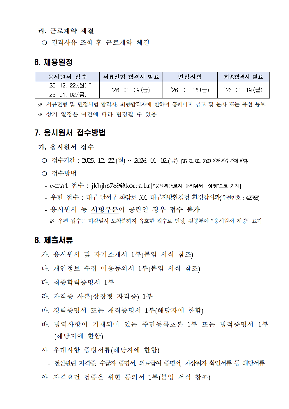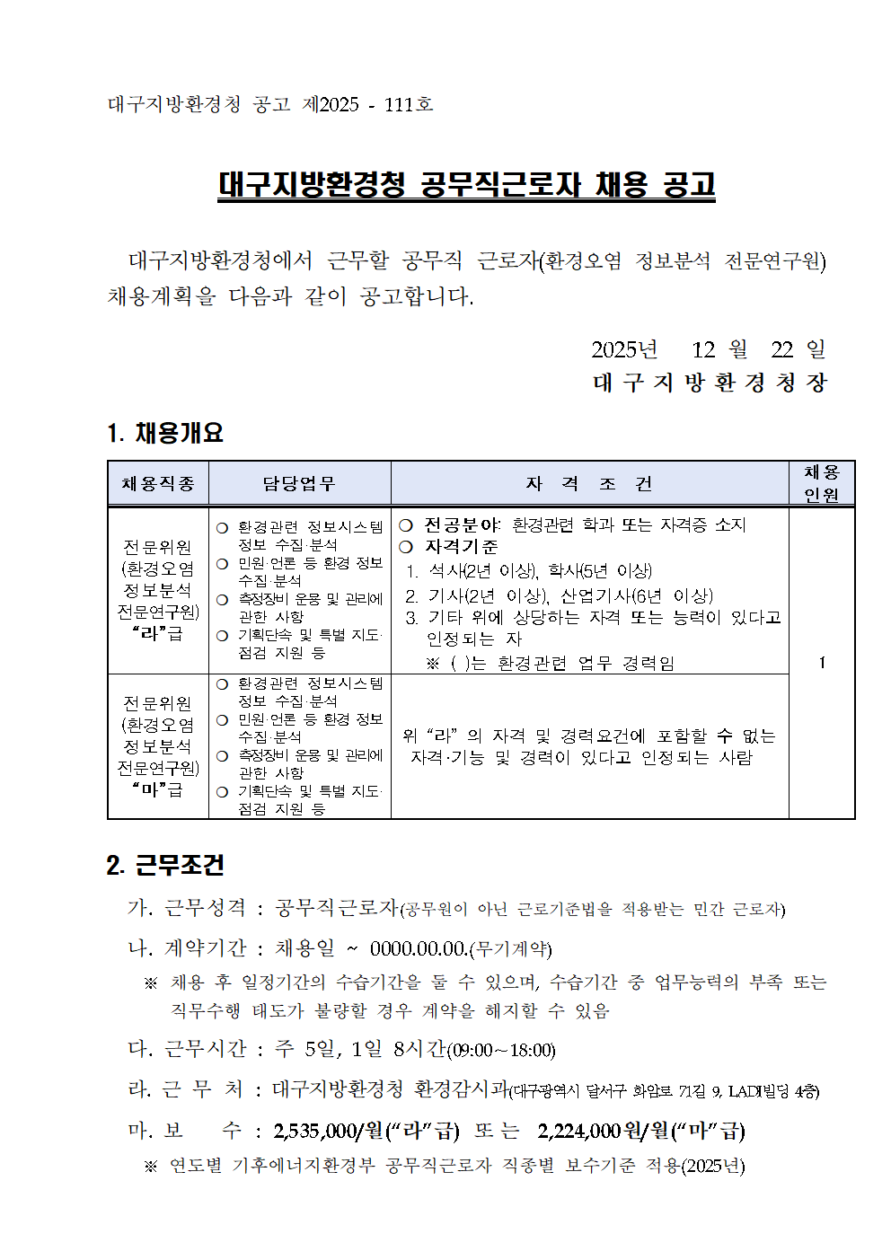 대구지방환경청에서 환경오염 정보분석 전문연구원 공무직 근로자를 채용하고자 하오니 관심있는 학생은 참고 바랍니다.